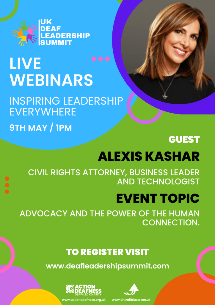 Our most recent webinar in the UK Deaf Leadership series reached out across the Atlantic Ocean to New York, USA. Dr Rob Wilkes interviewed Alexis Ander Kashar a sucessful civil rights attorney, advocate and entrepreneur. You can watch the recording here and see her personal take on leadership.